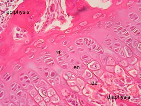 m = region where cartilage cells undergo mitosis en = region where cartilage cells are enlarging and matrix is calcifying de = region where cartilage cells are degenerating and will be replaced by bone |