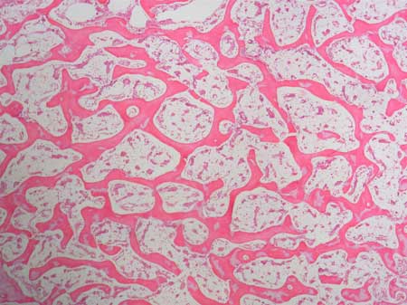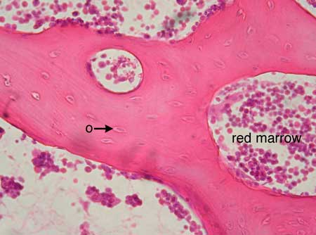Spongy bone is a network of irregularly-shaped sheets and spikes of bone (trabeculae). The trabeculae are only a few cell layers thick. The spaces between the trabeculae contain red or yellow marrow, depending on a person's age and on which bone it is. The marrow in these images is red marrow. Red marrow contains blood stem cells and blood cells in all stages of development. These cells are supported by a reticular connective tissue framework. In yellow marrow one would see abundant adipocytes instead of The arrow labeled o points to an osteocyte in its lacuna. Canaliculi (not visible here) connect the lacunae of osteocytes to each other and to the marrow spaces between the trabeculae. There are no blood vessels within the matrix of spongy bone, but blood vessels are nearby in the marrow spaces. Exchange of nutrients, gases, etc. occurs between capillaries in the marrow and the interstitial fluid of the marrow. The interstitial fluid extends into the canaliculi and thereby supplies the osteocytes. |