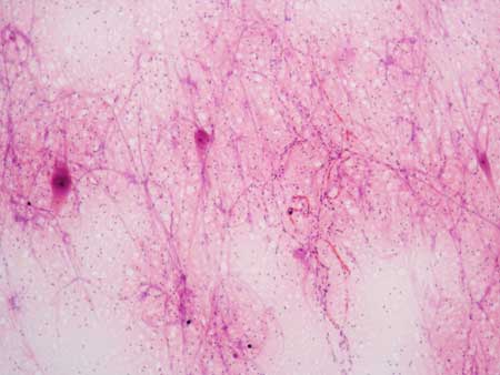 This preparation of neural tissue from spinal cord shows large neurons which are probably somatic motor neurons. Each somatic motor neuron has an axon which extends out of the spinal cord in a nerve and branches to contact a number of skeletal muscle cells. Neuro-transmitter released by somatic motor neurons stimulates contraction of skeletal muscle cells.