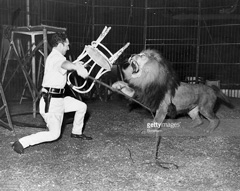 The illustration appears to be inspired by one or more of the many photos of lion tamer Clyde Beatty performing with lions. |