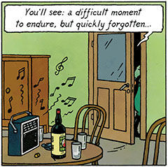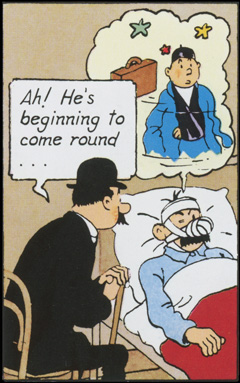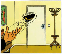 The coatstand Hergé illustrated on page 18 of Tintin and the Picaros is very similar to a Thonet Kleiderstock No. 4 and the Café Daum Kleiderstock. It’s a bit odd in the setting, a modern hotel room with modern furniture. On page 58, two empty Thonet No. 18 chairs are shown, recently occupied by Thompson and Thomson. |