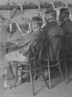 Soldiers testing gas masks at the American University Experiment Station. Public domain photo from the National Archives and Records Administration. |